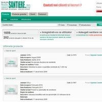 La data de 11 ianuarie 2009, in urma cautarii dupa cuvinte-cheie, s-au identificat urmatoarele rezultate: dupa tipul lucrarii (constructii civile = 1.419 proiecte si santiere, constructii industriale = 415 proiecte si santiere); dupa destinatia lucrarii (ansambluri rezidentiale = 343 de proiecte si santiere, locuinte = 602 de proiecte si santiere, hale = 209 proiecte si santiere, hoteluri = 56 de proiecte si santiere, centre si spatii comerciale = 137 de proiecte si santiere, imobile de birouri = 292 de proiecte si santiere); dupa stadiul de executie (fundatie = 227 de santiere, sapaturi = 79 de santiere, structura = 467 de santiere, proiect = 227 de lucrari); dupa regim de inaltime (imobile P+ ... E = 1.417 santiere, imobile P+1E = 360 de proiecte si santiere, imobile P+2E = 298 de proiecte si santiere, imobile P+3E = 245 de proiecte si santiere, imobile P+4E = 218 proiecte si santiere, imobile P+5E = 120 de proiecte si santiere, imobile P+6E = 89 de proiecte si santiere, imobile P+7E = 59 de proiecte si santiere, imobile P+8E = 71 de proiecte si santiere, imobile P+9E = 37 de proiecte si santiere, imobile P+10E = 43 de proiecte si santiere, imobile P+11E = 29 de proiecte si santiere, imobile P+12E = 27 de proiecte si santiere, respectiv imobile P+13-36E = 78 de proiecte si santiere). In ceea ce priveste criteriile cu privire la cereri si selectii de oferta, in baza de date exista 363 de proiecte pentru care se cauta antreprenor, in timp ce la alte 274 de lucrari este necesara aprovizionarea cu materiale de constructii. Astfel, raspunsurile la intrebari precum cine, ce si unde construieste pot fi identificate, in premiera, prin intermediul site-ului www.infosantiere.ro. Stadiile de executie posibile, in care se afla cele 1.841 de lucrari importante, publicate in baza de date www.infosantiere.ro, sunt urmatoarele: proiectare finalizata (se lucreaza la detalii) sau proiect aflat in autorizare (aviz de mediu, PUZ, PUD etc.); autorizatie de construire eliberata si/sau cautare in vederea stabilirii antreprenorului general si/sau a subantreprenorilor; antreprenor desemnat si lucrare aflata in etapa organizarii de santier sau de pregatire a infrastructurii; executie fundatie (sapaturi si excavatii, foraje, izolatii etc.); executie structura de rezistenta (cu mentionarea fazei); executie inchideri exterioare, compartimentari interioare, finisaje, dotari etc. De asemenea, pot fi regasite si selectii de oferte pentru alegerea antreprenorului general si a subantreprenorilor de specialitate, precum si pentru atribuirea contractelor de livrare de materiale de constructii si finisaje, dotari si servicii specializate etc. Mai multe informatii cu privire la baza de date www.infosantiere.ro obtineti la tel/fax: 021-336.04.16; 021-336.04.17; 031-401.63.88 (persoane de contact: Hermina Mares, Marius Manea, Dana Diaconu).