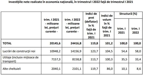 In trimestrul I 2022, comparativ cu trimestrul I 2021, investitiile nete realizate in economia nationala au crescut cu 1,2%, crestere inregistrata la elementele de structura: lucrari de constructii noi cu 4,5% si la utilaje (inclusiv mijloace de transport) cu 0,3%. Scadere s-a inregistrat la alte cheltuieli cu 14,0%.Vizualizaţi acum şi valorificaţi toate oportunităţile!