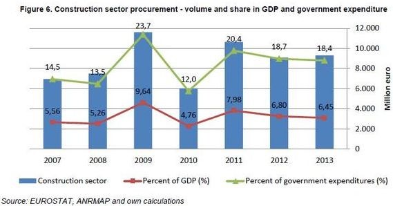 Potrivit datelor SAR, companiile de constructii contracteaza aproximativ 58% din valoarea totala anuala a achizitiilor publice inregistrate in cadrul SEAP. In 2007, cand sistemul electronic a fost pus in functiune, cheltuielile publice din domeniul constructiilor au insumat 7 miliarde euro. In 2009, valoarea totala a acestora a ajuns la 11,6 miliarde euro (atunci au avut loc doua etape de alegeri, pentru Parlamentul European si prezidentiale), iar in 2010 suma totala alocata pentru contractele de constructii a scazut la 6 miliarde euro. Indicatorul respectiv s-a majorat, din nou, la 10,6 miliarde euro in 2011, iar in 2012 si 2013 s-a stabilizat la circa 9,1 miliarde euro. "Daca comparam cheltuielile publice din domeniul constructiilor cu intreaga piata a achizitiilor publice, putem concluziona ca trendul general din domeniu se aplica in totalitate fiecarui sector economic. In pofida crizei economice, anul 2009 a reprezentat varful cheltuielilor publice atat in constructii, cat si la nivelul celorlalte sectoare, atat din punct de vedere al numarului si valorii contractelor scoase la licitatie, cat si din perspectiva ponderii din PIB a cheltuielilor publice", se mai precizeaza in raportul SAR.