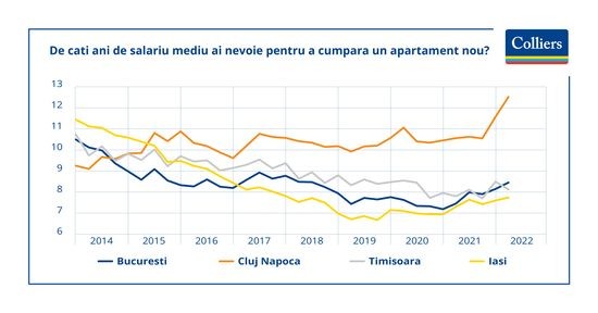 Tot mai putini romani isi permit sa-si cumpere o locuinta noua, avand in vedere ca preturile continua sa creasca intr-un ritm sensibil mai accelerat decat cel al salariilor, pe fondul scumpirii materialelor de constructii si a conditiilor economice prezente, care favorizeaza perceptia ca piata imobiliara ofera un refugiu in fata inflatiei. Cluj-Napoca ramane cel mai scump oras din tara, observa consultantii Colliers, unde achizitionarea unui apartament nou standard costa echivalentul unui salariu mediu incasat pe 12,5 ani de munca. Un bucurestean are nevoie de salariile pe 8,4 ani pentru o astfel de achizitie, timisorenii trebuie sa lucreze 8,1 ani pentru o locuinta noua, iar iesenii au cel mai redus nivel dintre marile orase, de 7,7 ani.In Bucuresti, Timisoara si Iasi, cele mai accesibile preturi pentru locuinte noi au fost la final de 2020 - inceput de 2021, dupa care evolutia a intrat pe o puternica panta ascendenta, potrivit datelor Colliers. Cluj-Napoca a cunoscut insa o evolutie aparte, locuintele noi fiind din ce in ce mai inaccesibile pe parcursul ultimilor 8 ani. Concret, la inceputul lui 2014, Cluj-Napoca avea cele mai accesibile locuinte dintre marile orase, cumparatorul mediu avand nevoie de 9,2 ani de salarii pentru achizitia unei locuinte noi, pe cand Bucurestiul si Timisoara aveau nevoie de 10,4 si respectiv 10,7 ani de salarii, iar in Iasi era necesara o perioada de 11,4 pentru acoperirea sumei platite pentru o astfel de achizitie.