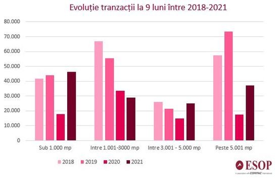 Numarul tranzactiilor cu spatii mai mari de peste 1.000 mp este mai mare decat in 2020, dar ramane inca mai mic decat in 2019.