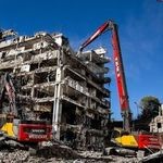 Gigantul norvegian Veidekke, care activeaza in domeniul constructiilor, a mobilizat un excavator Volvo EC750E HR pentru lucrul la inaltime mare pentru demolarea celebrei „House of Oslo”, o cladire cu 11 etaje care este una dintre cele mai mari din capitala Norvegiei.