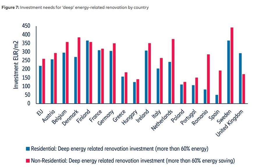 Aproximativ 30 de milioane de cladiri din Uniunea Europeana sunt incadrate in clasa energetica G, avand performante foarte slabe, prin bugetul UE fiind alocate peste 150 miliarde euro pentru renovarea acestora pana in 2030. Avand in vedere ca sectorul constructiilor din Uniune angajeaza mai mult de 18 milioane de persoane si contribuie cu aproximativ 9% la PIB-ul comunitar, valul renovarii poate crea circa 160.000 de locuri noi de munca in acest domeniu, se arata intr-un raport Allianz Trade.Necesarul investitional pentru o renovare aprofundata, care sa genereze economii de energie de peste 60%) difera foarte mult de la o tara la alta. O analiza la scara larga a proiectelor efective de renovare arata ca cele mai ieftine proiecte sunt implementate in Spania (aproximativ 50 euro/mp pentru proiectele rezidentiale), in timp ce preturile cele mai mari sunt raportate in Suedia (450 euro/mp, pentru cladirile nerezidentiale). Cu exceptia Marii Britanii, cele mai mari investitii in renovare sunt necesare pentru cladirile nerezidentiale.