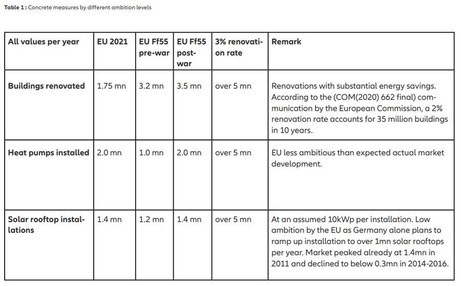Desi obiectivul de accelerare a programului de renovare conform Fit for 55 este clar, comparativ cu tintele actuale, noua ambitie este, inca, fezabila, pentru un motiv: obiectivele generale ale UE nu par deosebit de ambitioase in comparatie cu piata actuala, cu tintele, evolutiile si politicile anuntate de fiecare tara in parte, remarca analistii de la Allianz Trade. "In special, instalarea pompelor de caldura inregistreaza rate mari de crestere. De pilda, obiectivul guvernului german de a instala 11 GW de panouri solare pe acoperisuri pe an ar indeplini deja cea mai mare parte a obiectivului UE", se precizeaza in analiza.