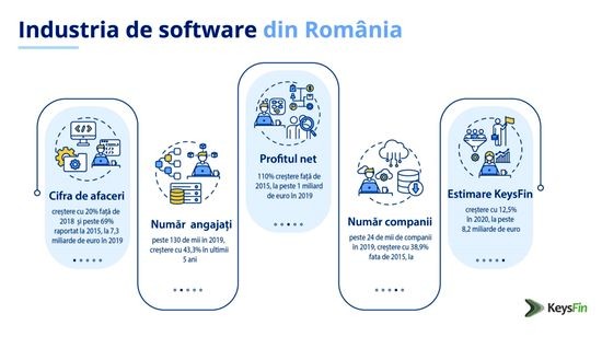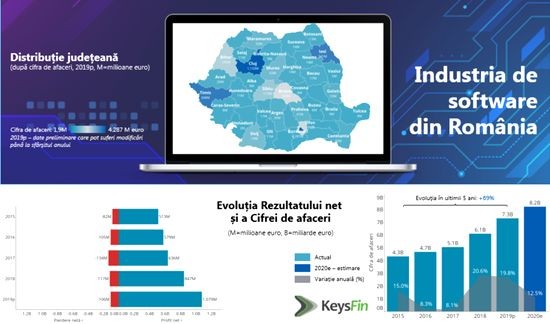 Industria de software din Romania va creste cu aproximativ 12,5% in 2020, ajungand la un volum de business de aproximativ 8,2 miliarde euro, potrivit estimarilor specialistilor KeysFin. Cu toate acestea, cresterea este mai temperata decat in 2019, cand sectorul a inregistrat o cifra de afaceri de 7,3 miliarde euro, cu aproape 20% mai mult decat in 2018 si peste 69% raportat la 2015.Industria de software din Romania se mentine in topul domeniilor-cheie pentru economia tarii, ponderea intregului sector IT&C in produsul intern brut fiind de 6,1% in 2019 si 7,1% in prima jumatate a lui 2020.