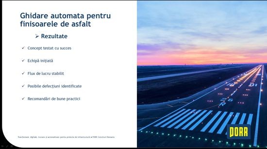 Un alt proiect pilot, realizat cu succes de PORR Construct, a presupus utilizarea ghidarii automate pentru finisoarele de asfalt (utilizand modele 3D). Acesta a fost realizat de companie pentru prima data in Romania la aeroportul Otopeni PDA2. Utilizarea finisoarelor de asfalt ghidate a adus un mare avantaj, intrucat a crescut viteza de lucru si calitatea lucrarilor. "Vom implementa acest mod de lucru si in proiecte viitoare. In prezent, avem in derulare, tot pentru lucrarile de asfaltare, un proiect pilot in care utilizam control continuu al compactarii (CCC), folosind aplicatia si compactoarele de la Bomag. In aplicatia instalata pe tableta si in cabina utilajului, putem urmari in timp real numarul de treceri, temperatura si alti parametri, astfel incat sa avem o imagine mai buna in timpul executiei si astfel sa asiguram o mai buna calitate a lucrarilor", a mai spus reprezentantul PORR Romania.