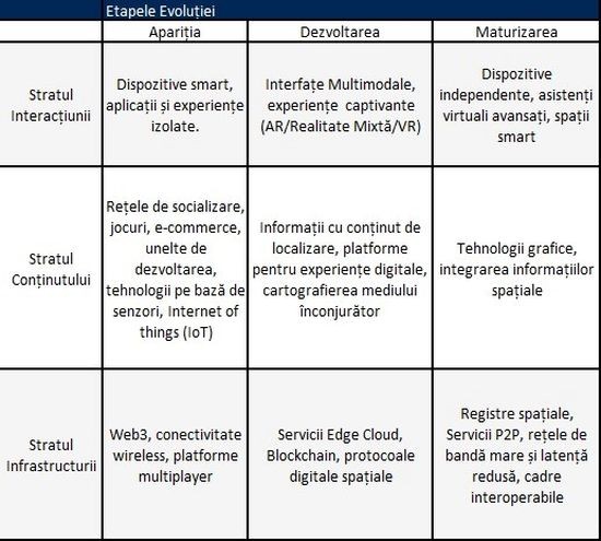 In acest moment suntem in etapa initiala de aparitie a Metaverse-ului - observam efectele solutiilor “premetaverse”. Fiecare etapa prezinta oportunitati care ofera capacitati de interactiune, continut si infrastructura in: