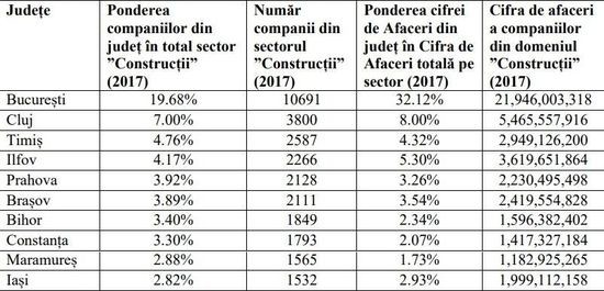 Putin peste jumatate din companiile active in sectorul constructiilor din Romania se regasesc in 10 judete, din care Bucurestiul detine cea mai mare pondere (aproximativ 20% din totalul firmelor active). Companiile din primele zece judete asigura doua treimi din cifra de afaceri a sectorului, cea mai mare pondere avand-o tot Capitala (32% din totalul sectorului). Judetele urmatoare in clasament sunt Cluj (cu 7% din companii si 8% din rulaj), Timis (4,76% din firme si 4,32% din afaceri) si Ilfov (4,17% din societati si 5,3% din cifra de afaceri).