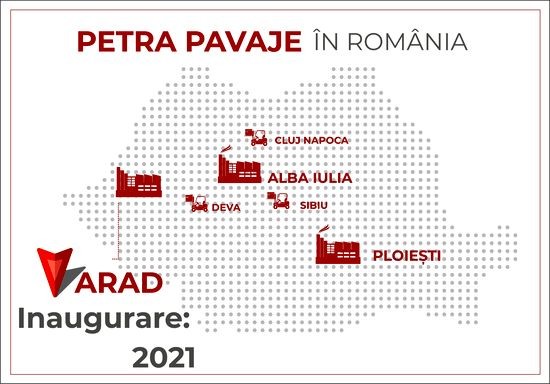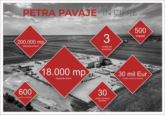 Petra Pavaje inregistreaza o evolutie spectaculoasa pe piata materialelor de constructii. Anul acesta, compania va inaugura cea de a treia fabrica de prefabricate de beton, localizata in comuna Vladimirescu din judetul Arad. Investitia se ridica la peste 10 milioane de euro, pe o platforma industriala de 100.000 mp. Petra Pavaje Arad va fi cea mai eficienta si mai moderna fabrica de prefabricate de beton din vestul tarii. Capacitatea fabricii va fi de 6.000 mp/ zi. Tehnologia folosita este de ultima generatie si este dezvoltata in colaborare cu producatori de top din Germania. Fluxul tehnologic al fabricii este integral automatizat, pentru a asigura o calitate optima a produselor.