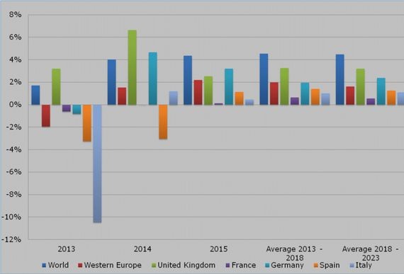 Revigorarea graduala a economiei europene isi va mentine ritmul lent si in perioada urmatoare, tensiunile din Ucraina si Orientul Mijlociu determinand o nesiguranta suplimentara mediului de afaceri si asa dificil din Europa. In pofida imbunatatirii usoare a economiei spaniole, tari precum Italia si Belgia continua sa se confrunte cu probleme majore si chiar si Germania, una dintre putinele economii stabile din perioada crizei, a dat semne de stagnare in ultima perioada, in pofida cresterii semnificative a PIB din aceasta tara in primul trimestru al anului in curs. Totusi, rata somajului din zona euro s-a micsorat usor, iar salariile medii din tarile respective au crescut cu cateva procente. Potrivit unei analize a companiei nord-americane de cercetare de piata IHS Global Insight, in perioada urmatoare este asteptata o depreciere suplimentara a monedei europene, ce va determina cresterea competitivitatii productiei din tarile de pe continent. In ansamblu, perspectivele economice din regiune sunt moderat-pozitive si, din cauza faptului ca economiile europene sunt mai puternic dependente de servicii decat de productie, vestile bune vizeaza cu precadere domeniul constructiilor. Scaderea inflatiei indica faptul ca Banca Centrala Europeana (ECB) mai poate astepta ca masurile de austeritate din toate tarile sa-si faca efectele in totalitate, desi din 2015 acestea vor fi mai putin vizibile.Astfel, analistii se asteapta ca PIB-ul Europei sa creasca, in termeni reali, cu 1% in 2014, cu 1,5% in 2015 si cu 1,6% in 2016, cu rezultate peste medie in Spania, care vor fi, insa, anulate de scaderi oarecum neasteptate in Italia si Franta. In contrast, economia Marii Britanii va performa bine, datorita cresterii consumului populatiei si a investitiilor private. PIB-ul Regatului Unit ar urma sa creasca, astfel, cu 3,1% in 2014, 2,8% in 2015 si 2,7% in 2016, un ritm dublu fata de celelalte tari din zona euro.