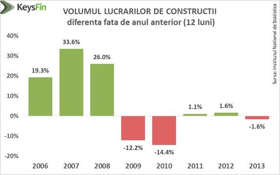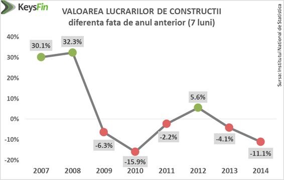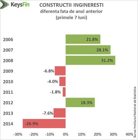 Sectorul constructiilor, domeniu ce ar trebui sa reprezinte unul dintre motoarele unei economii stabile, inregistreaza cele mai slabe performante din 2006 si pana in prezent, in conditiile in care in primele sapte luni din 2014 la nivelul volumului de lucrari ingineresti s-a consemnat cel mai mare declin din ultimii 8 ani, de cand exista date disponibile la Institutul National de Statistica (INS). Potrivit datelor interpretate de analistii companiei de informatii de afaceri si management al creditului KeysFin Romania, declinul de 26,9% (date ajustate sezonier) inregistrat de constructiile ingineresti in perioada ianuarie-iulie 2014 este fara precedent din 2006 pana in prezent. Cel mai slab rezultat inregistrat pana acum era anul trecut, de 7,6%. Constructiile ingineresti se refera, in principal, la lucrarile de infrastructura precum drumuri, poduri sau cai ferate, investitii care sunt realizate in principal de stat. Cum Guvernul a redus puternic investitiile in 2014, sectorul a intrat intr-o adevarata prapastie. "Statistica arata ca in primele sapte luni, statul a blocat o mare parte din investitii, motivul invocat fiind, bineinteles, cel financiar. «Gaura» tot mai mare din buget a facut ca statul sa stopeze investitiile pentru a avea cu ce sa acopere celelalte cheltuieli", au explicat analistii KeysFin. Astfel s-a ajuns ca, in ansamblu, sectorul constructiilor sa inregistreze, in intervalul analizat, o scadere de 11%, declin ce nu a mai fost depasit, in ultimii 8 ani decat o singura data, in 2010, cand sectorul constructiilor ingineresti a scazut cu 15,9% fata de nivelul din 2009.