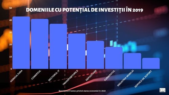 Dincolo de temerile privind cadrul macro-economic, Barometrul Frames indica si domeniile cu potential investitional din 2019, asa cum reies din estimarile oamenilor de afaceri. Intrebati care sunt sectoarele care vor aduce profit in acest an, cei mai multi manageri au indicat agricultura (43%), comertul (41%), sectorul IT (37%) si transporturile (29%).