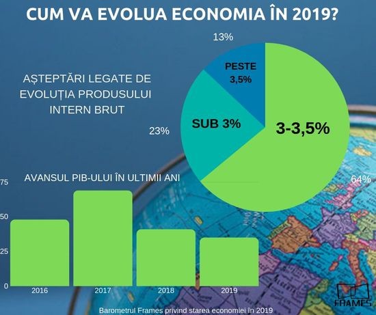 Economia romaneasca va continua sa creasca in 2019, insa ritmul va fi unul mai redus fata de 2018, estimeaza reprezentantii mediului de business. 64% dintre cei chestionati de compania de consultanta Frames in cadrul "Barometrului privind starea economiei" au indicat un avans al PIB-ului intre 3 si 3,5%, in timp cel 23% au estimat o crestere economica sub nivelul de 3%. Numai 13% dintre respondenti au estimat o crestere PIB peste nivelul de 3,5%.