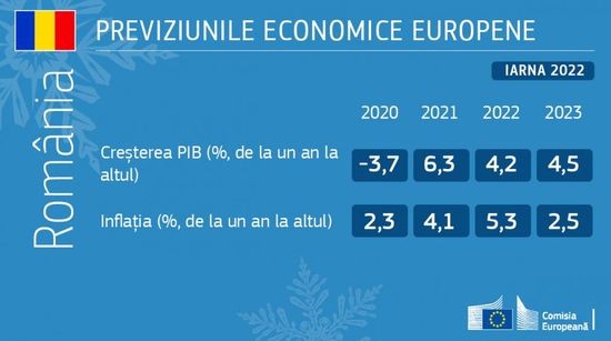 Previziunile economice din iarna anului 2022 estimeaza ca, in urma unei expansiuni semnificative de 5,3 % in 2021, economia UE va creste cu 4,0 % in 2022 si cu 2,8 % in 2023. In privinta Romaniei, se estimeaza ca, in 2022, cresterea economica va fi de 4,2%, respectiv 4,5% in anul 2023.