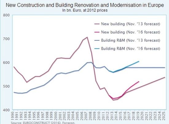 In primele luni ale anului 2010, sectorul european de constructii s-a mentinut sub prognoza pe termen scurt realizata in 2011 si criza euro a fost responsabila inclusiv pentru declinul din urmatorii doi-trei ani. De la revenirea pe un trend de crestere, din 2014, diferenta de crestere s-a redus. Ritmul lent de evolutie economica (estimat la +1,3% pe an, conform datelor prezentate la conferinta Euroconstruct din luna noiembrie 2016) va determina, in prima jumatate a anului 2020, o reducere a ritmului de crestere in constructii, acesta urmand a ajunge la maximum +1,5%.