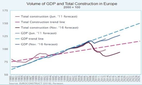 Ritmul de crestere a PIB european a incetinit din 2011, in special ca urmare a crizei din zona Euro, care a stopat cresterea economica in 2012 si a cauzat incertitudini economice care au rezultat, de pilda, in amanarea deciziilor de investitii in constructii. Cresterea PIB din 2016-2019 va fi mai rapida decat s-a previzionat in 2011, insa nu va fi atins nivelul estimat pentru 2020.