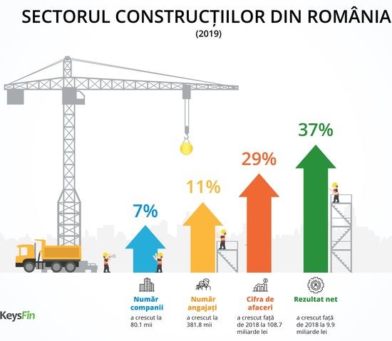 Cifra de afaceri a sectorului de constructii (constructii de cladiri, inginerie civila si lucrari speciale de constructii) a crescut cu aproape 30% fata de 2018 si a depasit cu 40% nivelul din 2015, ajungand la peste 108,7 miliarde de lei in 2019, potrivit celei mai recente analize KeysFin. Mai mult, pentru 2020, analistii estimeaza un maximum istoric, de peste 126 de miliarde de lei."Pandemia nu a inchis santierele din Romania, ba din contra. Acest sector si-a continuat cresterea accelerata atat datorita facilitatilor fiscale si guvernamentale mentinute (taxele salariale mici si programul Noua Casa), cat si datorita schimbarii comportamentului de consum de pe piata imobiliara: romanii si-au dorit case noi si mai spatioase. Pentru 2021, estimam o crestere la fel de sustinuta mai ales in privinta cererii, luand in considerare proiectele rezidentiale din toate zonele cheie ale tarii”, a declarat Roxana Popescu, Managing Director al KeysFin, unul din cei mai importanti furnizori de solutii de business information din Romania.