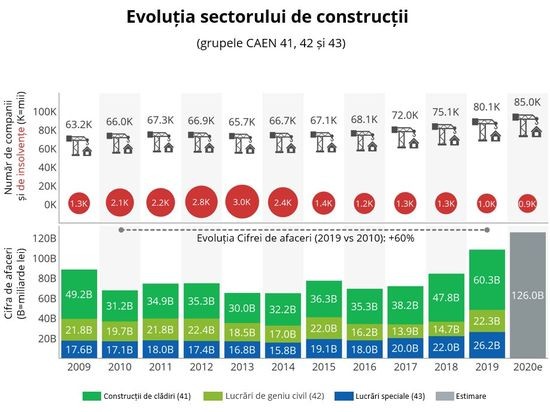 Aproximativ 80.000 de companii (10,5% din total) care si-au raportat rezultatele pentru 2019 au avut ca principal domeniu de activitate unul dintre codurile CAEN aferente sectorului de constructii, in crestere cu 6,7% fata de 2018 si cu 19,5% fata de 2015. Pentru 2020, analistii KeysFin estimeaza un avans de 6%, la aproximativ 85.000 de companii in baza datelor de la Registrul Comertului.