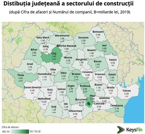 Ca distributie geografica, municipiul Bucuresti se afla pe primul loc in topul judetelor in functie de cifra de afaceri a business-urilor din constructii care au sediul aici, insumand 33,7 miliarde de lei si 31% din nivelul national in 2019, Capitala fiind urmata in clasament de Cluj (7% din total), Ilfov (6,2%), Prahova (3,7%) si Iasi (3,5%).