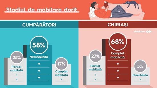 Un procent insemnat dintre chiriasi (85%), dar si dintre cumparatori (67%) se indreapta catre locuintele complet finisate, in timp ce 22% dintre cumparatori si doar 11% dintre chiriasi sunt dispusi sa aleaga o locuinta partial finisata (la gri). Interesul romanilor pentru locuintele fara finisaje (la rosu) este unul destul de scazut, cifrele demonstrand ca doar 11% dintre cumparatori si 4% dintre chiriasi ar opta pentru acest tip de locuinta. 80% dintre cei care cauta locuinte in cladiri noi doresc ca acestea sa fie la cheie, fata de 50% dintre cei care cauta mai degraba in cladiri vechi.Un alt aspect important evidentiat de acest studiu este acela ca spre deosebire de cumparatori, care cauta locuinte nemobilate (58%) si doar partial mobilate (25%), chiriasii se orienteaza intr-o proportie de peste 68% spre locuinte complet mobilate si 27% spre cele partial mobilate. Preferinta pentru achizitia in varianta nemobilata este evidenta indiferent de vechimea cladirii vizate ori de bugetul alocat respectivei locuinte.