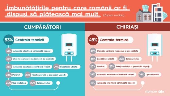 Principala imbunatatire pentru care atat cumparatorii (50%), cat si chiriasii (43%), ar fi dispusi sa plateaca mai mult este centrala termica. Urmatoarele pozitii in preferintele cumparatorilor sunt ocupate de: instalatia electrica schimbata recent, obiectele sanitare, instalatia sanitara noua. Chiriasii, in schimb, au mentionat ca ar scoate mai mult din buzunar pentru obiectele sanitare moderne si bucataria utilata.