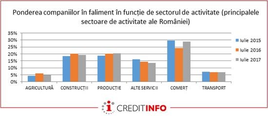 In ceea ce priveste companiile falimentare, cele mai multe se regasesc in sectoarele de comert (29% din totalul firmelor active in domeniu, in crestere fata de iulie 2016, de la 24%), productie (in crestere continua si constanta din iulie 2015, de la 18%, la peste 20%) si constructii (usoara scadere in iulie 2017 fata de iulie 2016, de la 20%, la 19%). Aceste companii au cel mai mare risc pentru creditorii sai, acestia nemaiputand sa-si recupereze debitele restante, mai arata analistii Creditinfo.