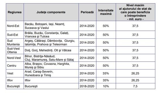 HG 807/2014 reglementeaza o Schema de Ajutor de Stat, gestionata de Departamentul de Ajutor de Stat din cadrul Ministerului Finantelor, care acorda finantare nerambursabila pentru proiecte de investitii de minimum 4,5 milioane RON (circa 1 mil. EUR), in cuantum de 10%-Bucuresti, 35%-Ilfov si Vest (Timis, Arad, Caras-Severin, Hunedoara) si 50%-restul tarii.
