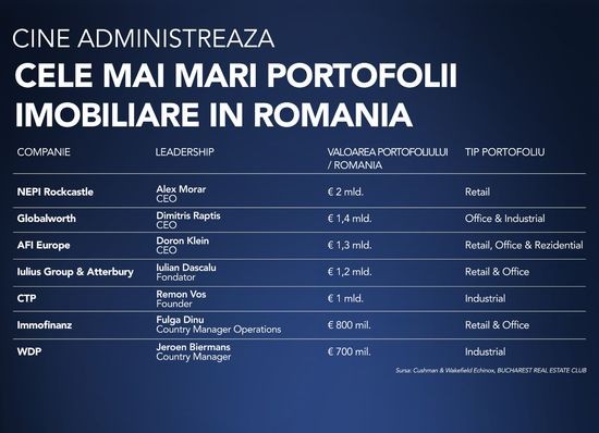 Astfel, Alex Morar - CEO al NEPI Rockcastle cu investitii in retail, Dimitris Raptis - CEO al Globalworth, cu investitii in portofolii de birouri, comerciale si logistice, Doron Klein, CEO al AFI Europe Romania, cu investitii in retail, birouri si rezidential, Iulian Dascalu, fondator al Iulius Group (retail si birouri), Remon Vos, fondator al dezvoltatorului logistic CTP, Fulga Dinu, Country Manager Operations Immofinanz, cu investitii in retail si birouri si Jeroen Biermans, Country Manager al dezvoltatorului logistic WDP administreaza cele mai valoroase portofolii imobiliare din Romania.