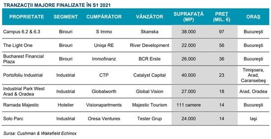 Valoarea totala a tranzactiilor cu active imobiliare comerciale din Romania s-a ridicat la 298 de milioane de euro in prima jumatate a anului 2021, in scadere cu 23% fata de perioada similara a anului precedent, piata fiind sustinuta in primul rand de revenirea apetitului investitorilor austrieci pentru imobile de birouri, conform raportului Romania Investment Marketbeat, lansat de compania de consultanta imobiliara Cushman & Wakefield Echinox.Astfel, cele mai importante trei tranzactii din primul semestru au fost parafate de investitori din Austria care s-au extins pe piata birourilor din Bucuresti prin achizitia imobilelor Campus 6.2 & 6.3 (S Immo), The Light One (Uniqa RE) si Bucharest Financial Plaza (Immofinanz). Cele trei tranzactii, cu o valoare cumulata de circa 189 de milioane de euro, reprezinta o cota de 63% din volumul tranzactionat in prima jumatate a anului.