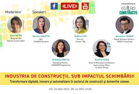 Joi, 26 mai 2022, va avea loc o noua editie din seria videoconferintelor EURO-Constructii - Industria de constructii: domeniu strategic, sub impactul schimbarii. Evenimentul se desfasoara incepand cu orele 10:00 si va avea ca tema centrala de discutie "Transformare digitala, inovare si automatizare in sectorul de constructii si domeniile conexe". Este a treia videoconferinta realizata pe aceasta tema de publicatia Agenda Constructiilor, dupa succesul pe care l-au avut editiile de la finalul lunii septembrie 2021, respectiv din martie 2022.