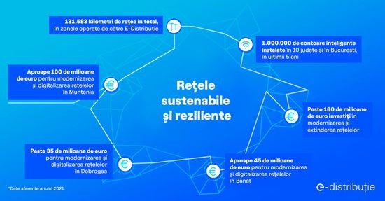 In Dobrogea, E-Distributie are planificate investitii de 176 milioane de lei in modernizarea si digitalizarea retelelor electrice. Din valoarea totala, 21 milioane de lei sunt planificate pentru lucrari de modernizare a liniilor si statiilor de transformare de inalta tensiune, 22 milioane de lei pentru lucrari de modernizare si constructie de linii de medie tensiune si posturi de transformare iar 35 milioane de lei pentru modernizarea liniilor de joasa tensiune. De asemenea, E-Distributie Dobrogea va instala 46.850 de contoare inteligente in judetele Calarasi, Constanta, Ialomita si Tulcea.