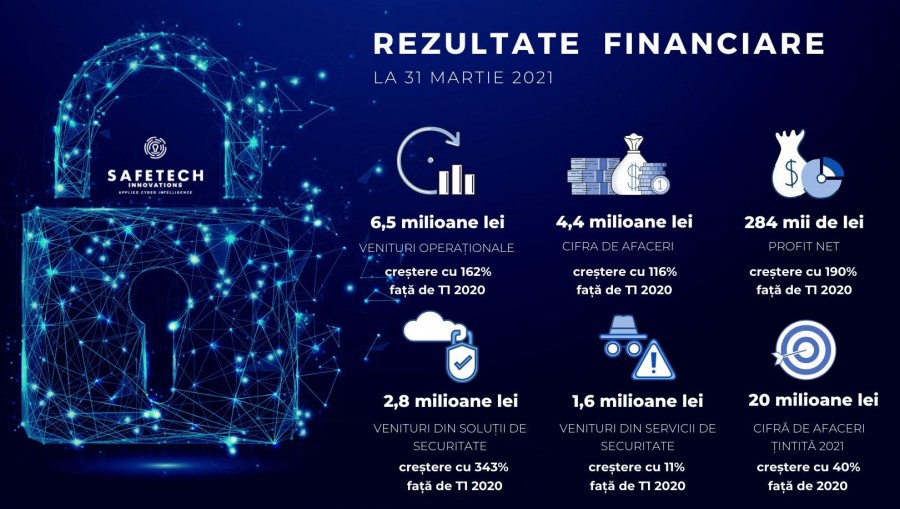 Safetech Innovations, o companie romaneasca de securitate cibernetica listata pe piata AeRO a Bursei de Valori Bucuresti, a raportat in primele trei luni ale anului 2021 venituri operationale de 6,5 milioane lei, cu 162% in plus fata de aceeasi perioada a anului trecut, cifra de afaceri de 4,4 milioane lei, in crestere cu 116% comparativ cu primul trimestru din 2020 si un profit net de 284 mii de lei, cu 190% mai mult fata de primele trei luni ale anului trecut. Compania estimeaza ca in 2021, cifra de afaceri va ajunge la 20 de milioane de lei, iar profitul net va atinge un maxim istoric de 4,5 milioane de lei in contextul cererii tot mai ridicate pentru solutii de securitate cibernetica.„Observam o cerere in crestere pentru servicii de securitate cibernetica atat in Romania, cat si pe pietele externe, determinata in primul rand de trecerea la munca de la distanta dictata de pandemia globala. Chiar in masura in care campaniile de vaccinare progreseaza si restrictiile se ridica, este clar ca organizatiile vor mentine, cel putin intr-o oarecare masura, modelul Work from Home. Acest lucru inseamna ca respectivele companii vor trebui sa se concentreze mai mult pe aspectele de securitate cibernetica pentru a asigura securitatea retelelor acestora, ceea ce reprezinta o oportunitate excelenta pentru noi pentru a ne creste cota de piata atat in Romania cat si in strainatate,” a declarat Victor Gansac, CEO al Safetech Innovations.