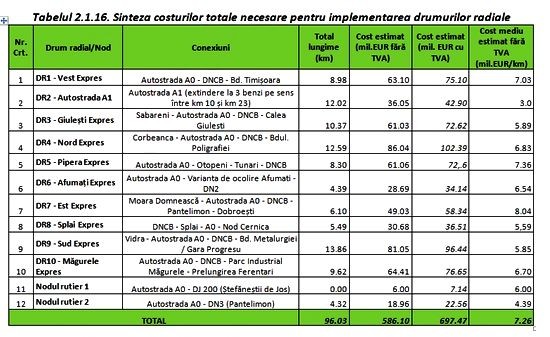 Costul total al proiector include costurile de expropriere rezultate pe baza grilelor notariale, insa acestea pot varia si vor fi definitivate in cadrul studiilor de fezabilitate.