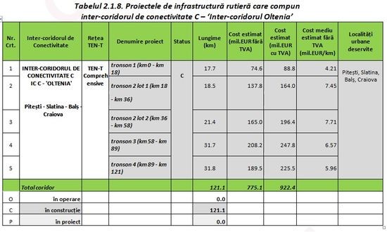 ●        Inter-Coridorul de conectivitate C (Inter-coridorul Oltenia) - acest inter-coridor este constituit de proiectul drumului expres Pitesti - Craiova si este compus din 5 proiecte aflate in diverse faze de executie, pe o lungime de 121 km. Inter-coridorul se suprapune retelei europene TEN-T Comprehensive si va creste mobilitatea intre coridoarele de conectivitate CC 1 Transcarpati si CC 5 Danubius. Pe de alta parte, acesta va constitui o axa de descongestionare a traficului de-a lungul DN65, in special la nivelul oraselor Slatina si Bals.