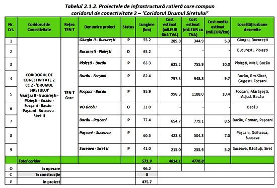 ●        Coridorul de conectivitate 2 (Drumul Siretului) - este compus din 9 proiecte de autostrada/ drum expres care asigura legatura pe axa nord-sud, intre Moldova si Muntenia, dar si intre Ucraina/ Moldova si Bulgaria, la nivel de tranzit continental. Lungimea coridorului este de aproximativ 570 km din care 96,2 km sunt in operare. Intregul coridor se suprapune retelei TEN-T Core. Proiectele de autostrada/ drum expres necesar a fi implementate pentru a se realiza continuitatea acestui coridor sunt: drumurile de mare viteza Giurgiu Frontiera - Bucuresti, Ploiesti - Buzau, Buzau - Focsani, Focsani - Bacau Sud, Bacau Nord - Pascani, Pascani - Suceava si Suceava - Siret Frontiera.