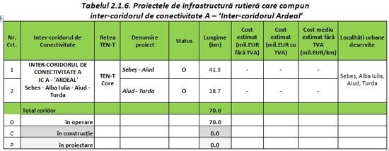 ●        Inter-Coridorul de conectivitate A (Inter-coridorul Ardeal) - se suprapune retelei europene TEN-T Core si este compus din 4 proiecte de autostrada (70 km in total) care conecteaza coridoarele de conectivitate 1 - Transcarpati de coridorul de conectivitate 4 - Montana intre Sebes si Turda. Loturile 1 si 2 corespunzatoare sectoarelor de autostrada dintre Turda si Aiud sunt in operare din anul 2018, iar loturile 3 si 4 dintre Aiud, Teius, Alba Iulia si Sebes sunt in operare din 2020 - 2021.