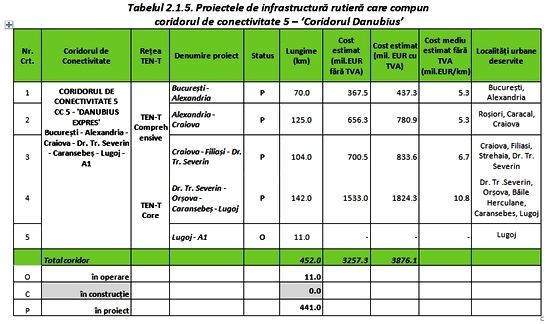 ●        Coridorul de conectivitate 5 (Coridorul Danubius) - este compus din 5 proiecte de drum expres care conecteaza Muntenia, Oltenia de Banat si, mai departe, de Europa Centrala. Coridorul de conectivitate are o lungime de aproximativ 450 km, din care doar 11 km corespunzatori legaturii autostrada A1 - varianta de ocolire Lugoj se afla in operare. Coridorul de conectivitate rutiera se suprapune atat retelei europene TEN-T Core cat si celei TEN-T Comprehensive, dupa cum urmeaza: sectoarele Bucuresti - Alexandria - Craiova si Dr. Tr. Severin - Lugoj apartin TEN-T Core, respectiv sectorul Craiova - Filiasi - Dr. Tr. Severin care apartine retelei TEN-T Comprehensive. De asemenea, la nivel european aceasta axa se suprapune coridorului european Orient East-Med, ce uneste Europa Centrala cu porturi de la Marea Nordului, Marea Baltica, Marea Neagra si Marea Mediterana. Interventiile necesare pentru realizarea coridorului de conectivitate Danubius sunt: drum expres Bucuresti - Alexandria - Craiova, drum expres Craiova - Dr. Tr. Severin, drum expres Dr. Tr. Severin - Caransebes - Lugoj.