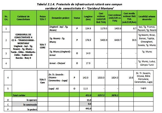 ●        Coridorul de conectivitate 4 (Coridorul Montana) - este compus din 9 proiecte de autostrada care conecteaza Moldova de Transilvania prin partea central-nordica a Romaniei. Coridorul are o lungime de aproximativ 577 km si se afla in operare si in faze avansate de construire intre Tg. Mures si Nadaselu (aproximativ 110 km). Sectorul de coridor estic (Ungheni - Iasi T Tg. Mures - Turda) se suprapune retelei europene TEN-T Core, iar sectorul vestic (Turda - Gilau - Suplacu de Barcau - Bors) face parte din reteaua europeana TEN-T Comprehensive. Interventiile necesare pentru realizarea coridorului sunt reprezentate de 4 importante proiecte de autostrada in lungime totala de aproximativ 470 km: autostrada Ungheni (inclusiv pod peste Prut) - Iasi - Tg. Neamt, autostrada Tg. Neamt - Tg. Mures, respectiv autostrada Nadaselu - Suplacu de Barcau si Suplacu de Barcau - Bors Frontiera.
