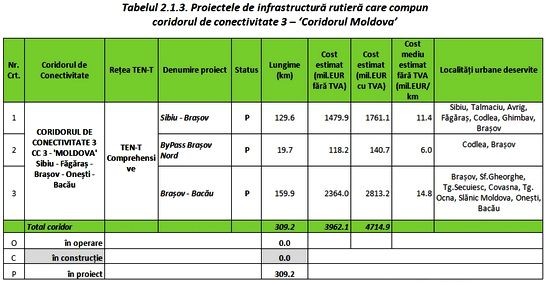 ●        Coridorul de conectivitate 3 (Coridorul Moldova) - este compus din doua proiecte de autostrada si un proiect de conectivitate intre acestea. Coridorul, in lungime de aproximativ 300 km, asigura legatura intre sudul Transilvaniei si Moldova si reprezinta o cale rapida de acces la coridorul de conectivitate 1. Intreg coridorul se suprapune retelei europene de transport TEN-T Comprehensive. Coridorul de conectivitate este compus din proiectele de autostrada Sibiu - Brasov si Brasov - Bacau care sunt legate de proiectul de autostrada ByPass Brasov - Nord.