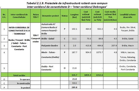 ●        Inter-Coridorul de conectivitate D (Inter-coridorul Dobrogea) - acest inter-coridor asigura legatura intre Moldova si Marea Neagra, respectiv intre coridorul de conectivitatea CC 2 Drumul Siretului in nord-vest si coridorul de conectivitate CC 1 Transcarpati in sud-est. Lungimea inter-coridorului este de aproximativ 324 km si este compus din mai multe proiecte: drumul expres dintre Autostrada A7 (ramurile Focsani si Buzau) si Braila (102 km), drumul expres Braila - Galati (11 km), podul suspendat peste Dunare (2 km - aflat in executie), drumul expres Macin - Tulcea - Constanta (Ovidiu) (187 km), autostrada ByPass Constanta - legatura spre Portul Constanta (21,8 km - aflat in operare din 2011/2013). Toate proiectele apartin retelei europene TEN-T Comprehensive.