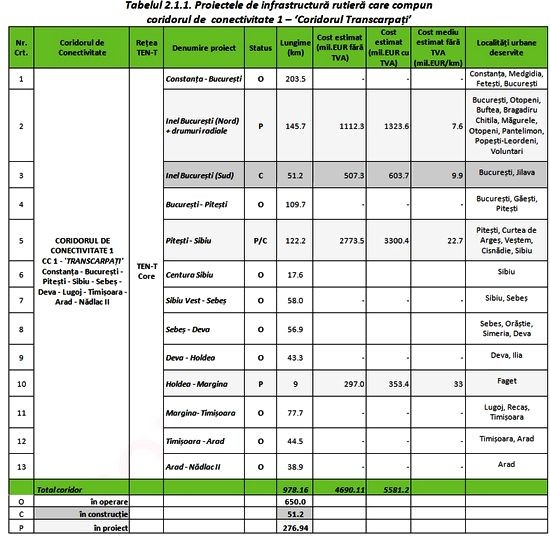 ●        Coridorul de conectivitate 1 (Transcarpati) - este compus din 13 proiecte de autostrada si asigura legatura intre Marea Neagra si granita de vest a tarii, pe o lungime de aproximativ 978 km, din care 650 km sunt in operare. Intregul coridor se suprapune atat retelei TEN-T Core, cat si ramurii nordice a coridorului european Rin-Dunare. Proiectele de autostrada necesar a fi implementate pentru a se realiza continuitatea acestui coridor sunt: Autostrada Inel Bucuresti + drumurile radiale (ramura nordica), Autostrada Inel Bucuresti (ramura sudica), Autostrada Pitesti - Sibiu, sectorul de autostrada Holdea - Margina.