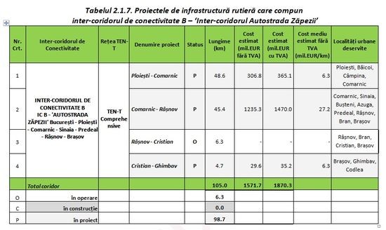 ●        Inter-Coridorul de conectivitate B (Inter-coridorul Autostrada zapezii) - este compus din doua proiecte de autostrada si are o lungime de aproximativ 105 km, suprapunandu-se retelei TEN-T Comprehensive intre Ploiesti si Brasov. Inter-coridorul asigura mobilitatea intre mai multe coridoare de conectivitate: CC2 Drumul Siretului, la sud, respectiv CC4 Moldova, la nord. Coridorul este compus din autostrazile Ploiesti - Comarnic si Comarnic - Rasnov - Cristian - Ghimbav (Brasov). In operare se afla aproximativ 6,3 km de autostrada corespunzatori sectiunii dintre Cristian si Rasnov.