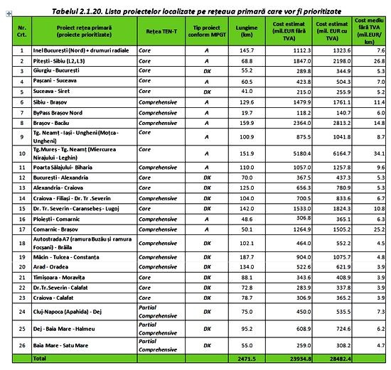 Ministerul Transporturilor propune si o lista de proiecte de pe reteaua primara, ce vor trebui realizate cu prioritate. Aceasta cuprinde 26 de drumuri, cu o lungime totala de 2.471 km si o valoare cumulata a investitiilor necesare de 28,48 miliarde euro (fara TVA).