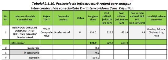 ●        Inter-Coridorul de conectivitate E (Inter-coridorul Tara Crisurilor) - acest inter-coridor asigura legatura si mobilitatea intre coridorul de conectivitate CC 4 Montana si coridorul de conectivitate CC 1 Transcarpati, intre Oradea si Arad. Lungimea inter-coridorului este de 134 km si se suprapune retelei europene TEN-T Comprehensive. De asemenea, acest inter-coridor este parte integranta a traseului Via Carpatia, ce are ca obiectiv major conectarea rutiera a Marii Baltice cu Marea Mediterana.