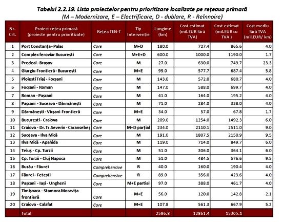 A fost stabilita si o prima lista de proiecte care apartin retelei primare si care va fi analizata multicriterial in cadrul procesului de prioritizare, formata din proiectele aflate in faza de executie si cele aflate in faza de proiectare. Lista cuprinde 20 de proiecte feroviare care apartin retelei TEN-T Core si Comprehensive a caror lungime insumeaza aproximativ 2.586 km si necesita diferite tipuri de interventii: modernizare, electrificare, dublare sau reinnoire. Costul estimativ pentru cele 20 de proiecte este de 12,8 miliarde euro (fara TVA).