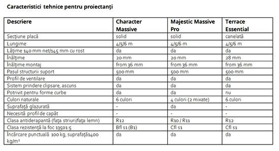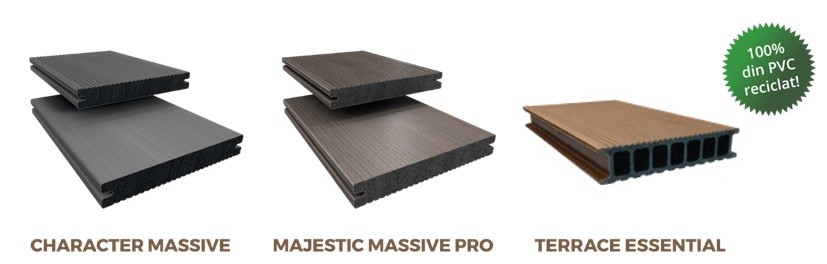 "Terrace Essential este varianta economica a profilelor Twinson care nu face rabat de la performantele tehnice. Majestic Massive Pro are si un strat suplimentar de polimeri de jur imprejur: petele si umezeala nu pot patrunde, curatarea si intretinerea sunt, prin urmare, deosebit de usoare, fiind, in acelasi timp, rezistent la zgarieturi. Suprafata din polimeri este potrivita pentru utilizare intensa, chiar comerciala. In acelasi timp, profilele Twinson sunt placute la atingere, arata cald si natural, iar spre deosebire de lemn, nu secreta rasini, nu crapa, nu se exfoliaza si raman ca noi de-a lungul anilor", explica specialistii Deceuninck.