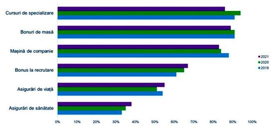 "Contextul pandemic si modul de lucru mixt work-from-home - work-from-office au determinat ajustari ale tipurilor de beneficii acordate de companii. Asigurarile de sanatate precum si cele de viata, alaturi de bonusul acordat la recrutare consemnand cresteri in timp ce cursurile de specializare, bonurile de masa si masina de companie au consemnat scaderi", mai arata analiza.