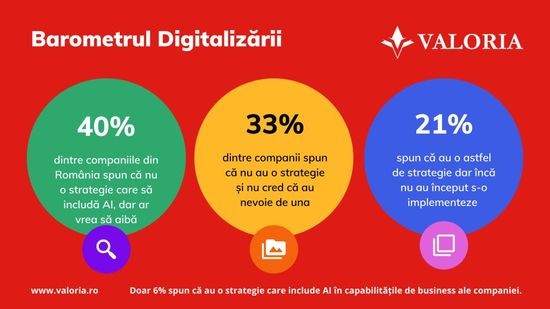 Pentru a valorifica din plin acest parteneriat, companiile trebuie sa inteleaga modul in care oamenii pot augmenta cel mai eficient masinile, dar si modul in care masinile pot imbunatati ceea ce oamenii fac cel mai bine. Refacerea design-ului proceselor de afaceri pentru a sprijini acest parteneriat va conta foarte mult. Conform datelor studiului Valoria Barometrul Digitalizarii, 40% dintre companiile din Romania spun ca nu o strategie care sa includa AI chiar daca si-ar dori, 33% spun ca nu au si nu cred ca au nevoie de una, in timp ce 21% spun ca au o astfel de strategie dar inca nu au inceput s-o implementeze si doar 6% spun ca au o strategie care include AI in capabilitatile de business ale companiei. Adoptarea AI tine si de etapa de maturitate in care se gasesc companiile din Romania. Potrivit aceluiasi studiu,52% din companiile din Romania sunt traditionaliste sau incepatoare in ce priveste digitalizarea.