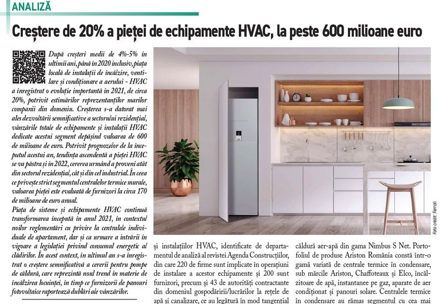 Analiza segmentului de HVAC include previziuni privind evolutia sectoarelor de centrale termice, boilere, cazane comerciale si aer conditionat, date privind activitatea principalelor companii care asigura livrarea si montajul de sisteme HVAC, noile standarde privind climatul interior, precum si perspectivele de dezvoltare in contextul necesitatii de aliniere a cladirilor la standardele nZEB. Analiza este completata de opinii ale unor reprezentanti de marca ai acestui domeniu, precum Catalin Draguleanu (senior director la Ariston Romania), Mihai Matache (director general Ferroli Romania), Valeriu Timofan (manager general Hoval), Cristiana Rosu (director general Radox), Attila Fazakas (Managing Director la Uniprest Instal), Daniel Vasile (Managing Director Daikin Romania), Cosmin Radulescu (Managing Director VTS Romania), Matsios Petros (directorul general al Thermostahl), Matei Neagu (directorul comercial al Alaska Energies), Dan Tudose (CEO al companiei e-acumulatori.ro) si Radu Parvu (directorul general al Movi Construct).