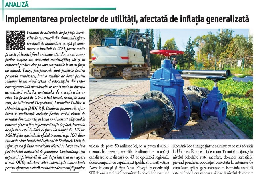 In sectiunea de Analiza, editia abordeaza problematica pietei locale de tubulatura dedicata proiectelor de infrastructura utilitara, sector afectat de inflatia generalizata din domeniul constructiilor, care creeaza presiuni asupra costurilor pe santiere si a derularii in conditii optime a proiectelor de investitii. Totusi, perspectivele sunt pozitive pentru perioada urmatoare, insa o conditie de baza pentru reluarea la un nivel optim al activitatilor din sector este reprezentata de masurile ce vor fi luate in directia actualizarii valorilor contractelor de executie a lucrarilor.